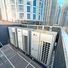 The installation of 8 heat pumps, specifically Aerotherm +5kW models, which efficiently supply heating and hot water to eight terraced houses